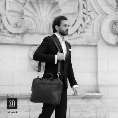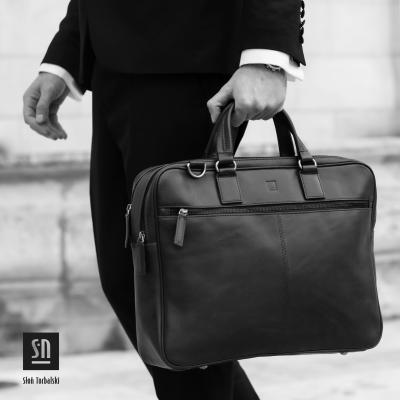 A classic dual-compartment bag made of brown leather. The bottom of the leather bag features metal feet to protect the leather and make it easier to set down. Each compartment closes with a zipper, and there is an exterior zippered pocket. One compartment includes a special divider for a laptop and two pockets, while the other compartment has a zippered pocket and two smaller pockets on the opposite side. It can be carried by hand or with a long strap, worn cross-body. There is a full-length zippered pocket on the front of the leather bag. Additionally, a leather strap with a carabiner allows you to attach keys or other items. This leather bag is highly functional and versatile, suitable for both men and women.