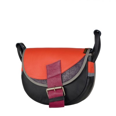 The Freshman Mini is a stylish semi-circular leather crossbody bag for women, made entirely from genuine leather. Its classic black base is accented by a two-tone flap: a bold coral section paired with a crescent-shaped insert in shimmering dark purple, creating a modern and feminine contrast.