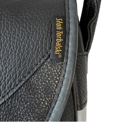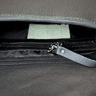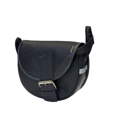 The front panel is made from black pebbled leather, giving the bag a sophisticated texture, while the sides and back are crafted from smooth full-grain leather in the same deep black tone. The two-tone flap adds a distinctive touch — the main black pebbled leather is complemented by a crescent-shaped insert with a subtle silver shimmer, catching the light beautifully.