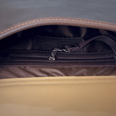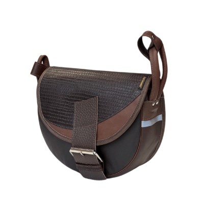 The front of the bag is crafted from dark pebbled leather, while the sides are made of smooth leather in a milk chocolate shade, creating a subtle, harmonious contrast. The flap features a two-tone patchwork – the larger section is made of dark brown snake-textured leather, while the insert is light brown pebbled leather, giving the bag a distinctive and stylish character.