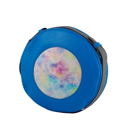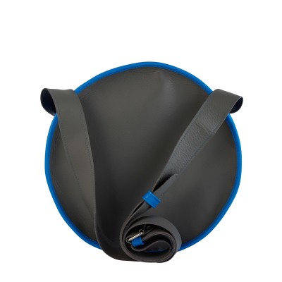 HOLY – Round Women’s Bag in Genuine Leather The HOLY round bag is crafted from high-quality smooth natural leather. Its base is a stylish shade of blue, featuring a central leather insert with a vibrant rainbow pattern of blurred floral motifs, giving the bag a unique and eye-catching look. The model comes with a long, wide adjustable strap in a soft ash gray color, matching the back panel of the bag, creating a harmonious design. The bag closes securely with a zipper to keep your belongings safe. The interior is thoughtfully designed and includes: a zippered pocket, a card slot, pen holders, a key leash, a lining. The bag fits A5 format items and measures 30 × 30 × 7 cm. HOLY is a fashionable and versatile accessory that complements any outfit and suits women of all ages.