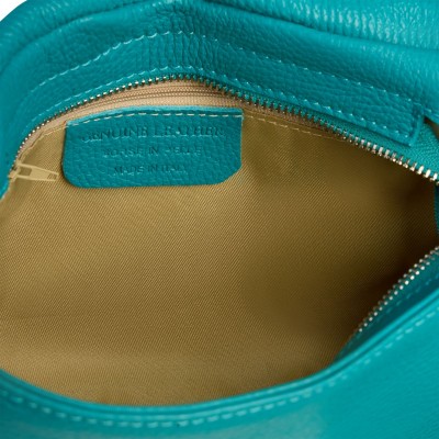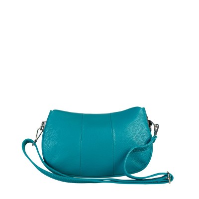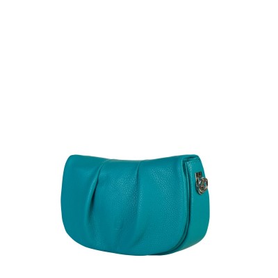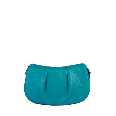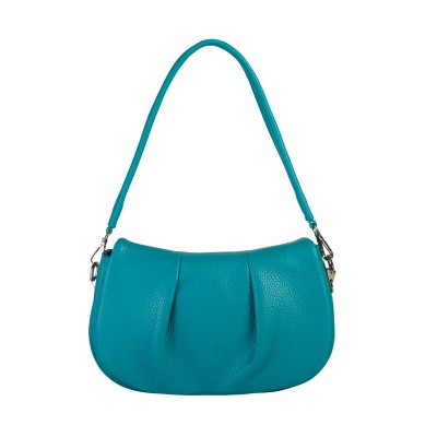 Made from premium Italian pebbled leather in a vibrant blue-turquoise shade, the bag features a flap with decorative pleats and an embossed brand logo, secured with a magnetic closure for a refined finish.
