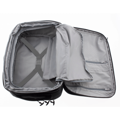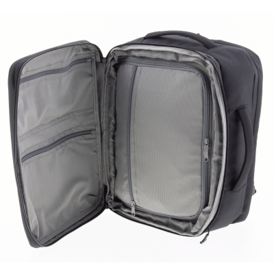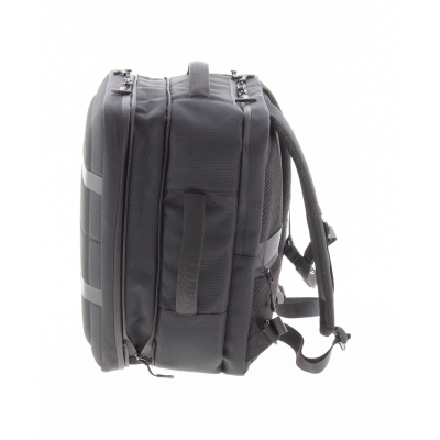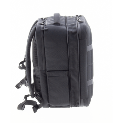 A modern, versatile cabin backpack designed for everyday use and travel. Crafted from water-repellent material, it features a semi-rigid front panel, hard-to-access zippers and hidden pockets for enhanced security. The interior includes a padded compartment for a laptop or tablet, multiple organizers for documents and accessories, and a strap to attach the backpack to a suitcase. The size is approximately 40 × 30 × 20-25 cm, capacity over 20 L, weight about 1.2 kg – lightweight yet spacious. The sleek black finish gives it a timeless and professional look. This backpack is an excellent choice for those who value safety, functionality and style in one.