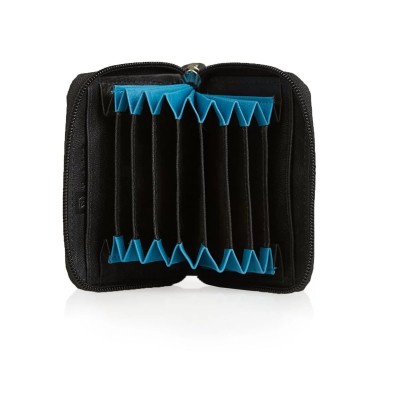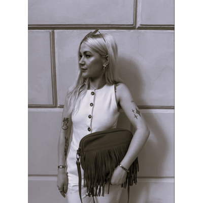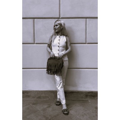 Gift set: fringed handbag and card holder. This elegant and stylish set is a perfect choice for any woman. The handbag is made of genuine black leather and fastens with a zipper. Inside, it features an open pocket, card slots, a zipped pocket, and a key strap. The long adjustable strap allows for a customized fit. On the outside, there is an additional zippered pocket for small essentials. The striking long fringes give the handbag a unique and fashionable look. The card holder includes eleven compartments arranged in an accordion style. Its classic black color matches perfectly with the handbag, creating a cohesive and elegant set. This ready-made set is an excellent gift idea for any occasion.