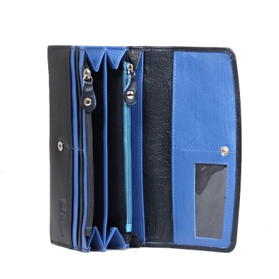 The wallet, in classic black with a contrasting blue interior, stands out with its smart layout: six card slots, compartments for banknotes and coins, plus additional sections to keep everything organized.
