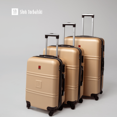 This is a travel suitcase distinguished by a metal, colorful logo of Słoń Torbalski and embossed decorations. This ultra-light suitcase weighs only 2,7 kg and has a capacity of 42 l. This is a small cabin suitcase made of ABS material.