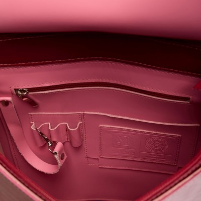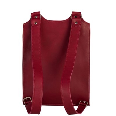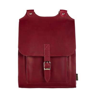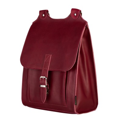 The Bookpack leather backpack is a leather model in burgundy. It is made entirely of smooth, grained leather. The leather backpack has a flap, under which there is a main compartment with a zipper and a large pocket for small items on the front. The flap is fastened with a single briefcase latch mounted on a strap with a buckle.