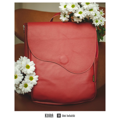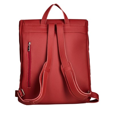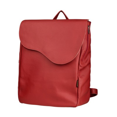 A spacious backpack crafted from high-quality pebbled natural leather in a vibrant red color. The side zippers add a modern touch and allow the backpack to expand, giving you extra room whenever you need it and making packing effortless.