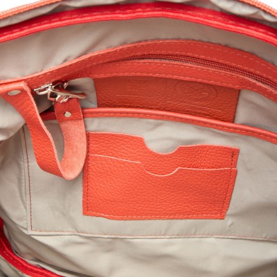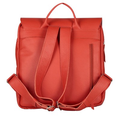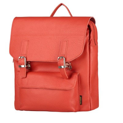 The coral-colored leather backpack named Teofila is made from genuine leather. The model fits A4 items and measures 35x31x8.5 cm. It closes with a zipper, a snap fastener (tik tak), and buckles, with a small magnetic pocket below.