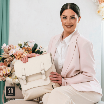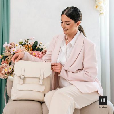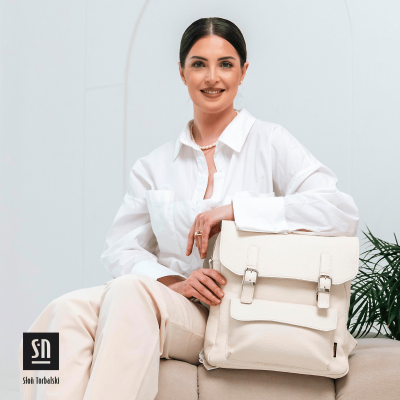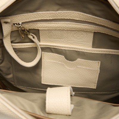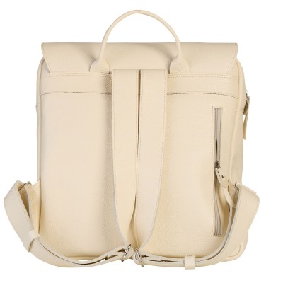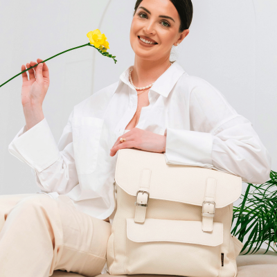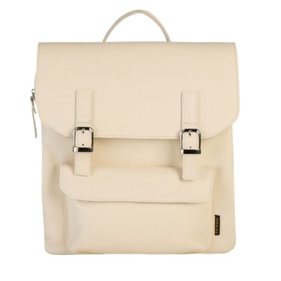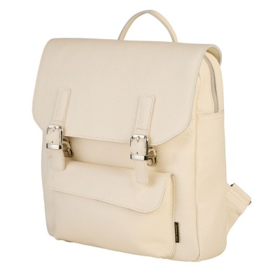 Leather backpack model Teofila - a spacious leather backpack made entirely of natural leather in the color of wool white. It has a flap and a zipper under it, and additionally the flap fastens with two buckles and two tick-tock fasteners.