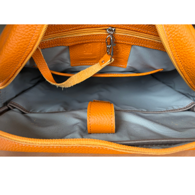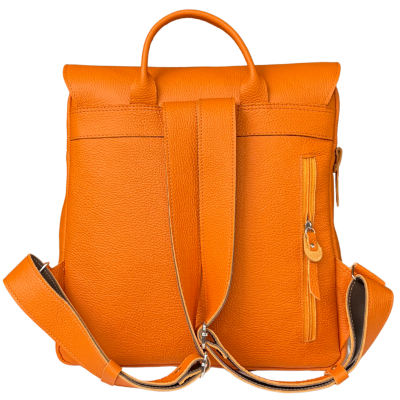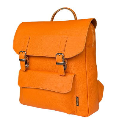 The Teofila model is a spacious backpack made entirely of natural pebble-grain leather in a vibrant orange color. It combines functionality with style, suitable for daily use or more formal occasions.