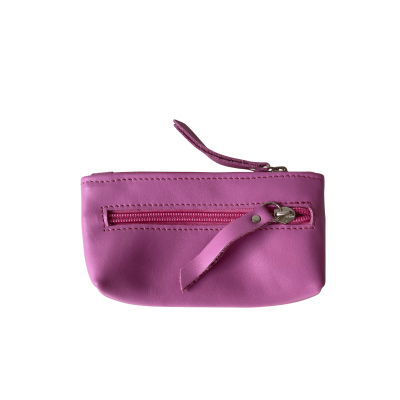 A high-quality key case made of genuine leather, measuring 15x8x2 cm, in a pink color — a practical essential for everyone. The interior features a fabric lining on one side and a raw leather design on the other, along with a 17 cm leather tongue with an attached carabiner for securing keys. On the outside, there is a zippered pocket, and the pink color makes it easier to find the case inside a handbag. This versatile model can also be used as a small makeup pouch or for storing loose change.