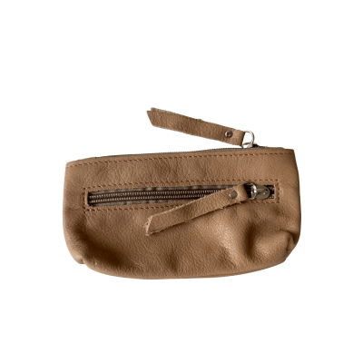 A beige leather key case measuring 15x8x2 cm is a stylish and practical accessory for everyone. The interior features a fixed 17 cm leather tongue with a carabiner-style key holder. This leather case is versatile — it can serve as a small makeup pouch, a coin holder, or for storing other small essentials. On the outside, there is an additional small zippered pocket for added convenience.