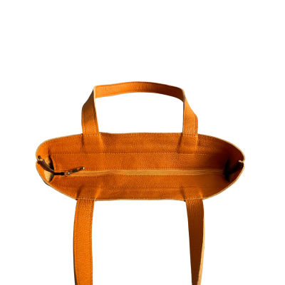 Thanks to its long handles, the bag can be carried comfortably by hand or over the shoulder. The main compartment closes with a matching orange zipper.