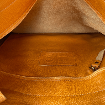 This elegant leather shopper bag is made of high-quality, thick natural leather with a pebbled texture, in a bold and vibrant orange color. With its simple, classic shape and practical size, it’s perfect for everyday use or more formal occasions.