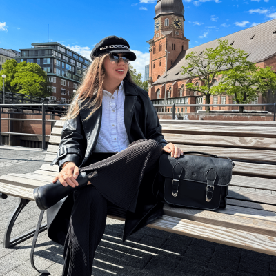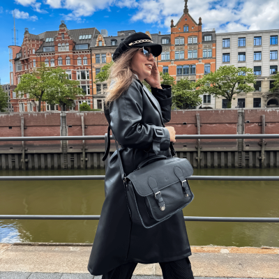 Black leather messenger bag with a flap made of genuine leather with a pea-grain texture. The main compartment holds A4 format and is fastened with a zipper. It can be worn in three ways: on the shoulder, over the shoulder (diagonally) thanks to the long strap for adjustment or in the hand thanks to the handle. There is a large unfastened pocket on the front and a large zipped pocket on the back. The leather messenger bag has a flap that closes thanks to the snaps that are mounted on two straps with buckles. The shape of the leather bag is in a vintage style. Its size of 32x23.5x10 cm allows for a wide range of uses for different styles. It can be worn to school, college, work.