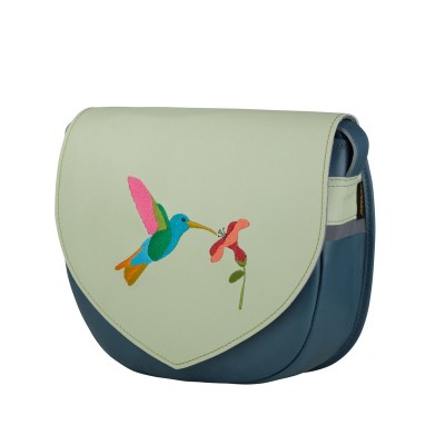 A colorful embroidered hummingbird and flower on the flap add a charming folk-style accent. The bag fastens with a zipper and a rounded magnetic flap, combining style with security. On the back, there’s a convenient zippered pocket for quick-access items.