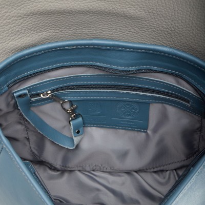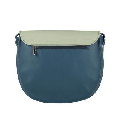 The Birdy is a medium-sized leather handbag for women, crafted from genuine leather. Its base and trim come in a soft blue-grey tone, creating a subtle contrast with the flap in light chartreuse green.