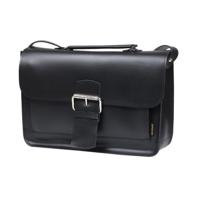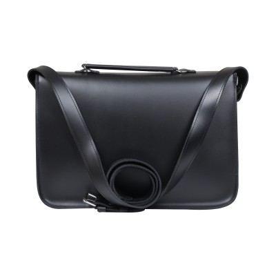 Black A4 Leather Bag — Boston Słoń Torbalski Unisex Leather Messenger Bag made of smooth natural leather in black. The bag features a classic design and practical dimensions (34x24x9 cm), making it an ideal everyday companion for both men and women. The leather used is stiff, allowing the bag to maintain its shape even when empty. A handle on the flap makes it possible to carry the bag by hand. This A4-sized natural leather bag comes with an adjustable strap (max. length: 125 cm). Under the flap, there’s a convenient pocket. A large front buckle adds a timeless character to the design. The spacious main compartment includes: A key leash, A zippered pocket, A phone pocket, Pen slots. Explore our other handmade leather handbags, all crafted in Kraków. 100% HANDMADE