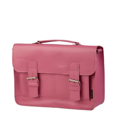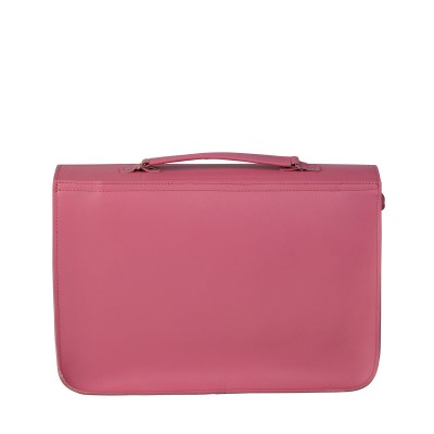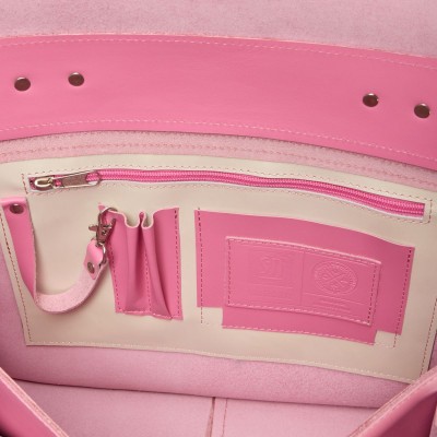 A pink leather handbag measuring 35x25x10 cm, suitable for A4 documents. The interior includes a sewn-in panel with a zippered pocket, a small open pocket, a key leash, slots for writing utensils, and the brand’s logo. Under the flap, there is an open pocket for everyday essentials, and the main compartment is secured with a snap closure. The bag also features a carrying handle and an adjustable strap (150 cm long), allowing for a perfect fit to your silhouette. This leather handbag, with its unique briefcase-like design, is an excellent choice for students as well as for work or office use.