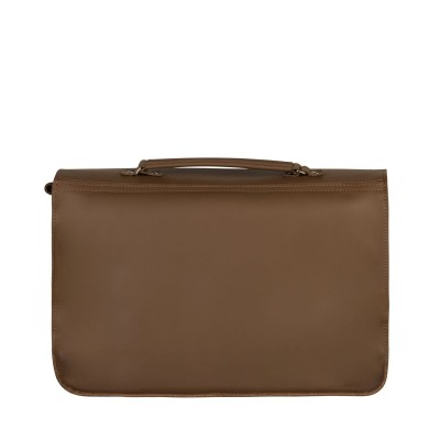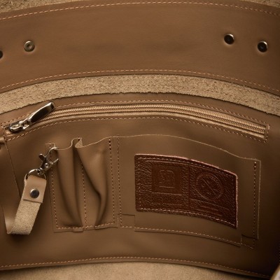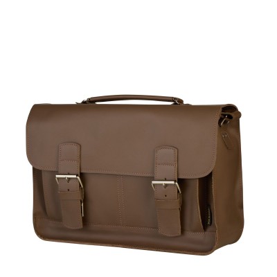 Unisex leather shoulder bag is made of smooth natural leather and is dark beige in color. Practical handle in the form of a leather handle allows you to carry it in your hand, in addition it has a long strap for adjustment (max. length 125 cm). The whole is closed with a flap fastened with two briefcase-style snaps mounted on wide straps with buckles. Under it there are two pockets for small items.