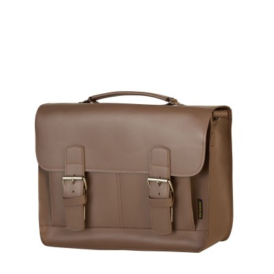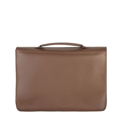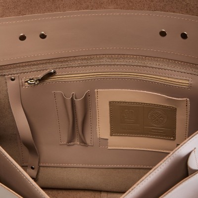 Unisex leather shoulder bag is made of smooth natural leather and is dark beige in color. Practical handle in the form of a leather handle allows you to carry it in your hand, in addition it has a long strap for adjustment (max. 125 cm). The whole is closed with a flap fastened with two briefcase-style snaps mounted on wide straps with buckles. Under it there are two pockets for small items. The interior includes: - a zipped pocket - a key lanyard - a leather pocket for cards/monthly ticket - a pocket for pens - dimensions 35 x 24 x 9 cm - fits A4 format The classic shape allows you to use this leather shoulder bag for work, school and college.