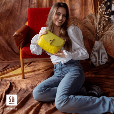 Leather shoulder bag. Main body make of nubuck leather in yellow colour.