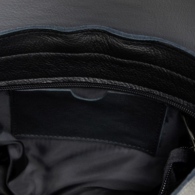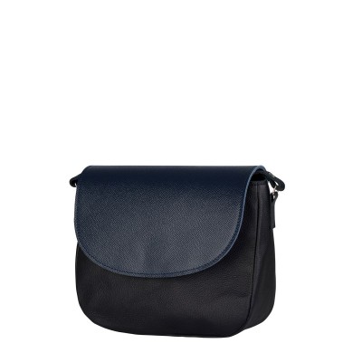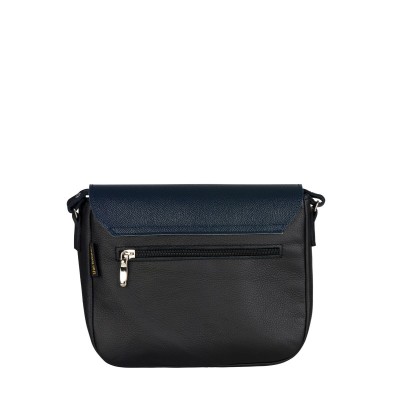 A small leather handbag named Camila in black and blue, measuring 18x20x6 cm, is a great choice for women who like a modest accessory to complement their style. The main compartment includes a card holder and closes with a zipper. The blue flap secures with a magnetic snap, and the zippered pocket on the back is perfect for carrying essentials.