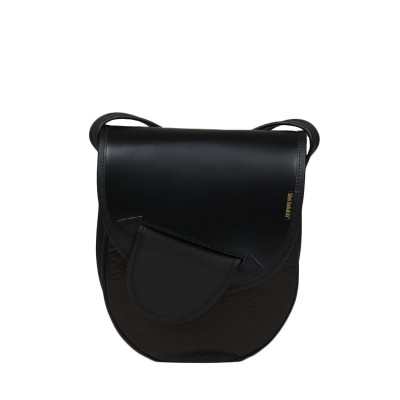 The main body is made of dark brown leather and the flap is made of smooth black leather.