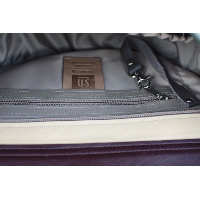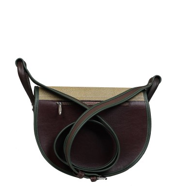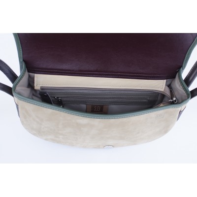 Main body grain leather in mixed colours. Khaki decorative leather flap with decorative inset. Inside: leather strengthened zipped pocket; pocket for mobile phone; pocket for pens; key leash; lining.