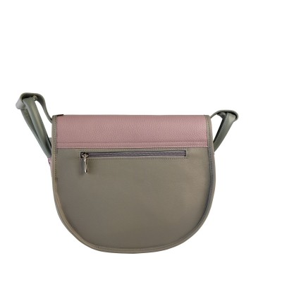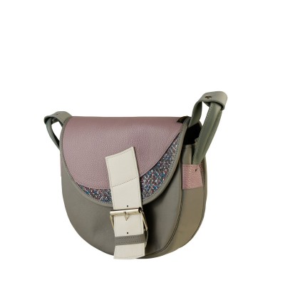 of smooth natural leather. The front, sides and back are in ash gray. The bag has a flap in dirty pink and a crescent-shaped insert, multi-colored. The flap is fastened with a magnet, which