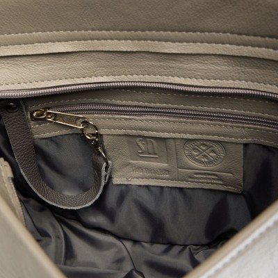 is hidden under a white strap with a buckle. In addition, the whole bag is closed with a zipper. The bag has a long light gray strap