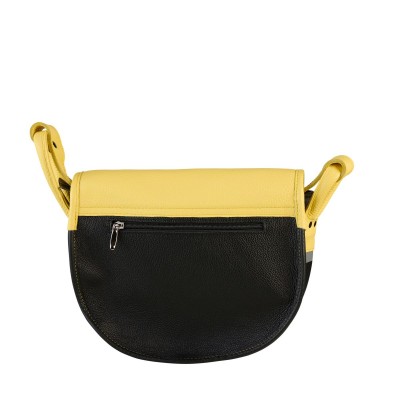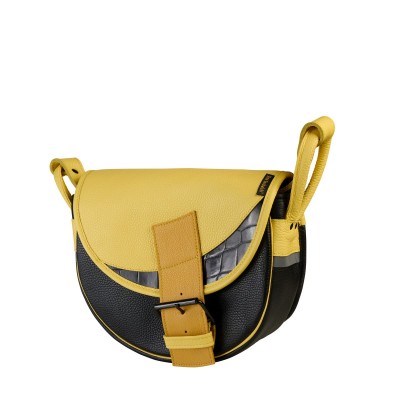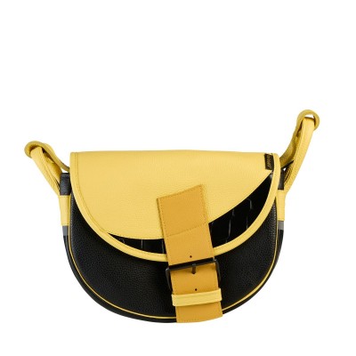 The bag has a yellow flap and a crescent-shaped insert in black, with a smooth leather texture. The flap is fastened