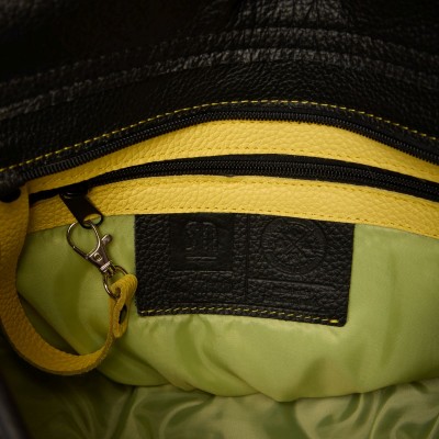 with a magnet, which is hidden under a yellow, darker strap, with a buckle. In addition, the entire bag is closed with a zipper.
