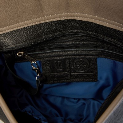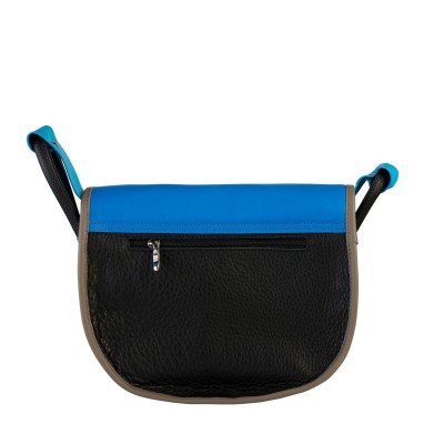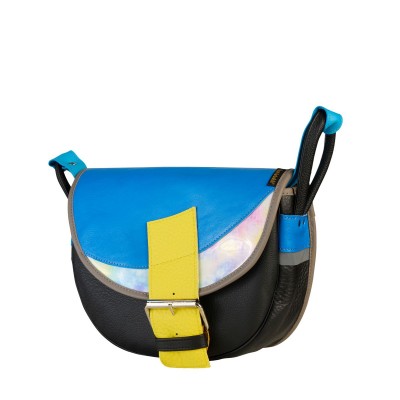 The Freshmen model is a semi-circular shoulder bag made from high-quality natural pebbled leather. The front, back, and sides come in classic black, while the flap features a vibrant blue shade for a striking contrast.