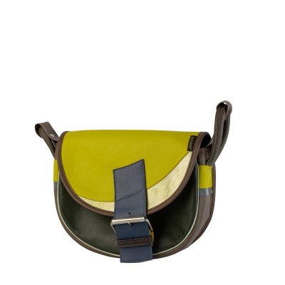 Handcrafted from smooth natural leather, it balances elegance with a modern edge. The dark green body is outlined with a beige-grey trim, while the flap in mustard yellow and deep green draws immediate attention.