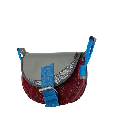 This half-moon leather crossbody bag is crafted from natural leather and suede in a unique combination of textures and colors. The front and sides feature a deep burgundy suede with an embossed floral motif, adding elegance and an artistic touch. The back is made of smooth grey leather, while the flap combines a muted green-grey tone with a crescent-shaped black and silver accent featuring a subtle shimmer.