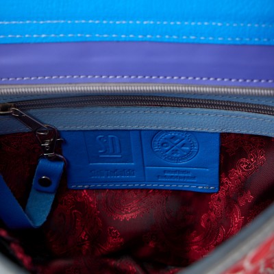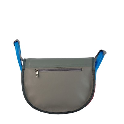 The flap closes with a hidden magnetic clasp beneath a decorative blue strap with a metal buckle. The main compartment is also secured with a zipper for added safety. A long, adjustable grey strap is attached at the sides with blue leather loops, which are accented with reflective details for enhanced visibility after dark. There’s also a zippered pocket on the back for easy access to essentials, and the front edge is finished with a thin piping in the same tone as the flap.