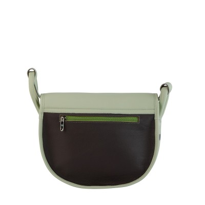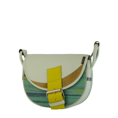 Freshmen Mini is a semi-circular crossbody bag made from natural leathers. The front of the bag is made of green nubuck leather decorated with multicolored stripes. The sides and flap are light green, while the back is dark brown. The flap features an old gold crescent-shaped insert and fastens with a magnetic snap hidden under a yellow strap with a buckle. The entire bag also closes with a zipper.