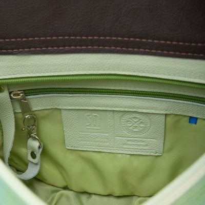 The bag has a long, adjustable light green strap sewn onto the sides, with reflective elements beneath the strap attachment points. On the back panel, there is a zippered pocket. The front is additionally trimmed with a thin piping matching the flap color.