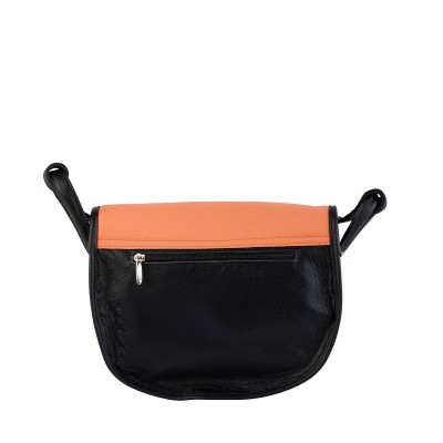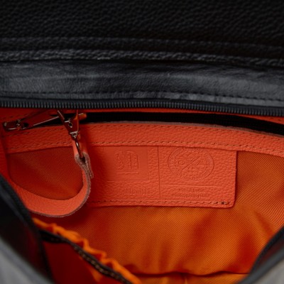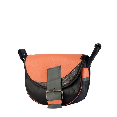 The Freshmen Mini is a half-moon-shaped crossbody bag made of smooth, natural leather. The front, back, and sides are classic black, while the flap stands out with pebbled leather in a light orange shade. A crescent-shaped insert in dusty pink and grey with an embossed pattern adds a unique touch.