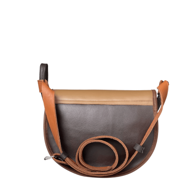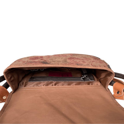 The Freshman Mini Messenger Bag is a semi-circular bag made entirely of genuine leather. The front is made of dark olive/burgundy suede leather with a floral pattern, while the sides are made of dark brown full-grain leather. The flap is two-tone. Most of the flap is a light, warm brown (cappuccino) made of smooth leather, with an inlay in various colors, creating a paisley pattern. The bag closes with a flap with a magnetic closure, hidden under a silver buckle and a dark bottle green strap. The bag has an adjustable camel strap. Reflective elements are sewn into the sides of the bag. Interior features: - zippered pocket - ??key lanyard - 3 pen slots - small ticket/card pocket - ??brown lining - soft strap, max. length 125cm, width 3cm - fits A5 format The bags design is versatile and complements any style.