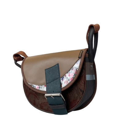 The front panel is made of embossed suede in deep burgundy and green shades, with a subtle antique gold shimmer. The flap is structured and crafted from smooth, firm leather in a dark beige tone, while the crescent-shaped insert on the flap showcases a multicolored floral pattern.