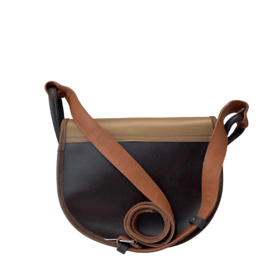 The Freshman Mini is a semi-circular women’s crossbody bag crafted from high-quality genuine leather. This stylish piece features a unique combination of colors, textures, and decorative elements that make it stand out.