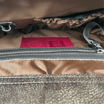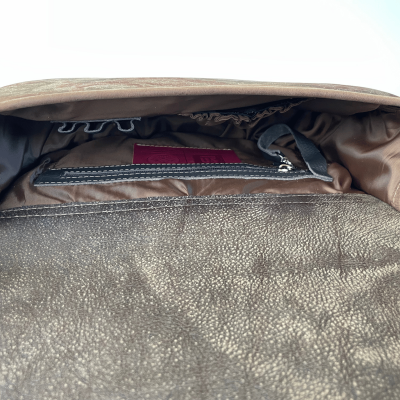 The long adjustable shoulder strap (3 cm wide, max. length 125 cm) is made of brown leather and sewn onto the sides. Subtle reflective accents are discreetly integrated beneath the strap attachments for added visibility.