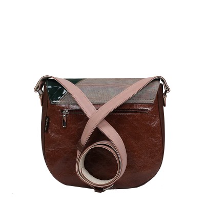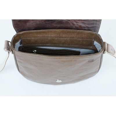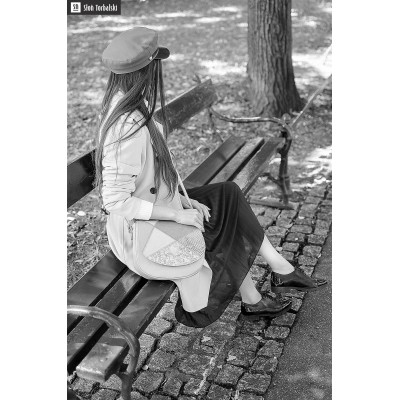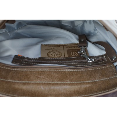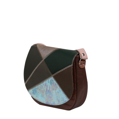 Leather shoulder bag handmade - Mała Zu Medium-sized genuine leather shoulder bag with a patchwork flap. Stylish casual bag made of natural leather in a dark beige color. The flap is made of a combination of embossed decorative leather in various shades of brown and blue. The main compartment of the messenger bag is closed with a zipper, and the whole thing is closed with a magnet hidden under a decorative flap. Inside there is: - zip pocket, - additional pocket, e.g. for a phone, - 2 pen slots, - key lanyard, - lining.
