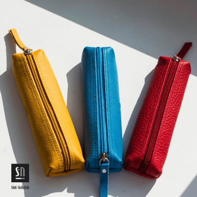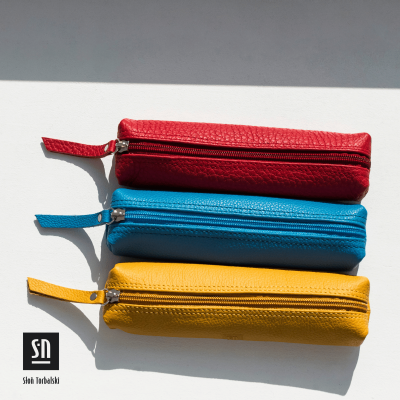 Leather pencil case made of natural leather in blue. It has a solidly sewn-in zipper finished with a leather handle in the same color as the whole. In the middle of one side is the Słoń Torbalski company logo embossed. The entire leather pencil case is solidly sewn and made. The interior is raw leather without lining. Dimensions are about 20x2.5 cm
