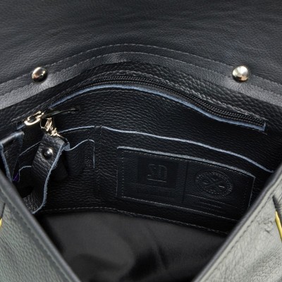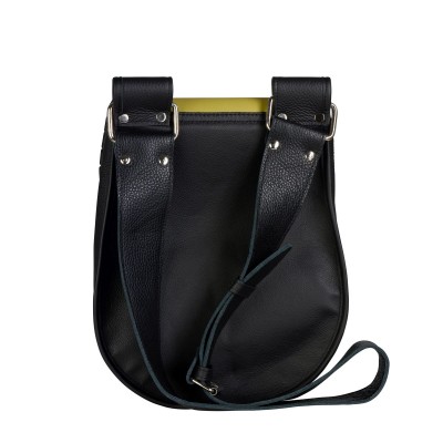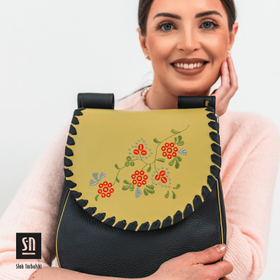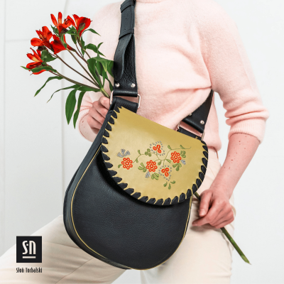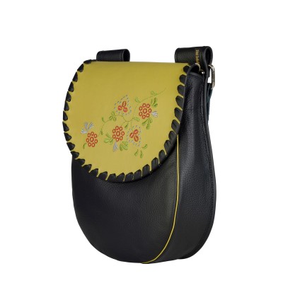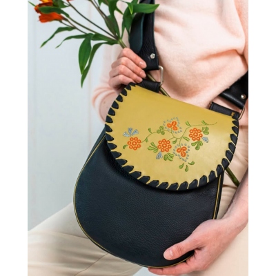 The leather bag with the playful name Basia Flo measures 35 cm x 27 cm x 8 cm and comes in black with a striking mustard flap featuring floral embroidery, secured with a magnetic snap. The interior is equipped with a zippered pocket, an open pocket, and compartments for writing utensils.