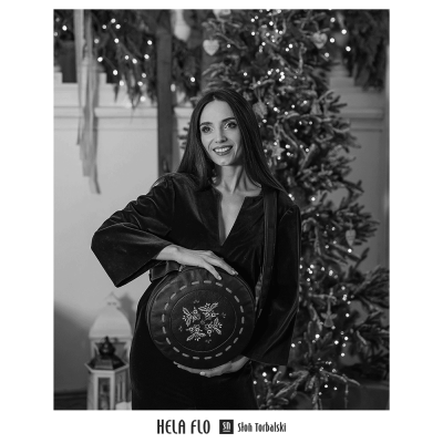 Its distinctive round shape immediately catches the eye and makes it stand out from classic handbags. The central element is a decorative insert with colorful embroidery inspired by plant motifs, giving the bag a unique, slightly folk-inspired character. The design is enhanced by a decorative braided black cord around the embroidery, which adds a distinctive and artistic touch.