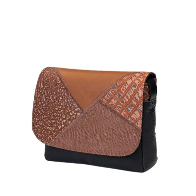 The base of the bag is deep black, while the flap features a striking patchwork in shades of brown, blending different leather textures: pebbled, crocodile, and cracked-earth finishes, giving the bag a distinctive character and one-of-a-kind charm.